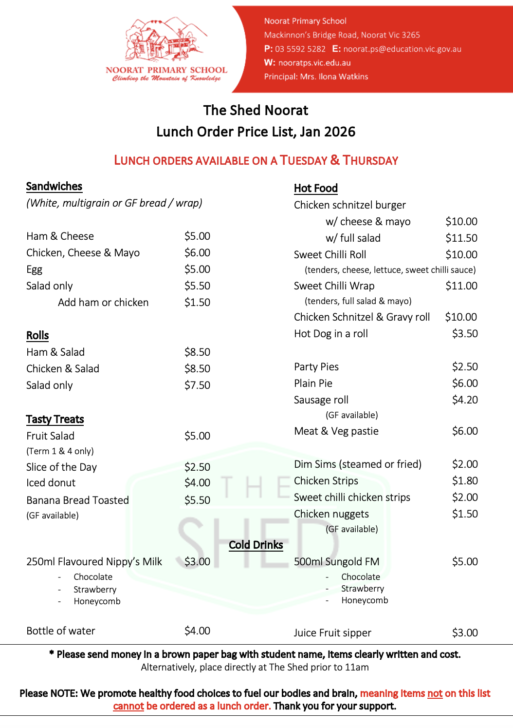 Lunch Order Price List 2026